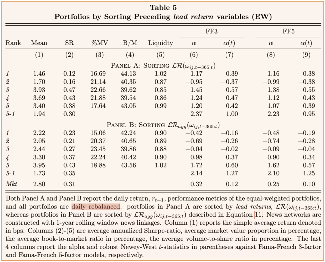 在控制了市场溢价、规模因素、盈利能力等因素后,无论lead股票和follower股票之间的业务关系如何,他们之间的收益都具有较强的共振效应。新闻共现图的月度degree是一个很好的预测股票横截面收益的指标。一个月的再平衡投资组合测试表明,degree提供了显著的正Alpha(相对Fama-French三因子和五因子模型)。
