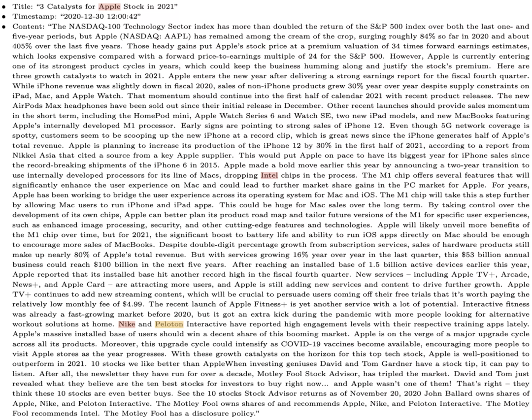 首先,作者基于股票在新闻中提及的位置,将出现在标题中的股票定义为lead,同时将出现在新闻正文中的其他股票定义为follower。例如下面这篇新闻,Apple出现在新闻标题中,则Apple为leader;Intel、Nike及Peloton出现在正文中,它们就是follower。共现股票收益关联性研究