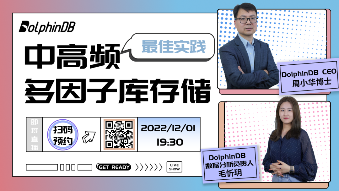 为了使广大用户更方便地实现因子计算和管理,助力更高效的投研和生产,DolphinDB 结合多年服务金融量化机构的经验,已经实现了部分国内常用因子库,并且支持研究和生产一体化。下文中,将基于高频多因子存储场景,为大家介绍一个基于 DolphinDB 实现的因子库和因子存储方案,对比不同存储模式下的性能。这里也给大家推荐一下,12月1日(周四)晚7点半,DolphinDB CEO 周小华博士和 DolphinDB 数据分析负责人毛忻玥将在线上开讲,围绕因子库性能对比、高频多因子存储解决方案的优劣势分析展开讨论,并结合实际案例展示高频多因子存储的最佳实践。干货满满!快来报名吧~国泰君安 191 Alpha 因子库