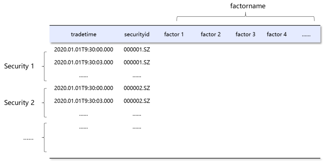 因子数据在实际存储时通常会有宽表和单值模型两种选择。宽表模式数据如下表所示,宽表模式的面板数据通常是计算所需要的,这个模式存储的数据,可以直接供给量化程序计算,但是宽表模式的数据存储在因子新增和因子数据修改场景会耗时比较高。单值模型一般有4列:时间戳、股票代码、因子编号以及因子值,如下图所示;单值模型的数据在需要面板数据的场景,需要将数据转换成面板模式。针对以上两种模式的存储,我们设计以下两种存储方案,两种方式均采用 TSDB 引擎进行存储:按 月 Value 分区 + 因子名 Value 分区 , SortColumn: SecurityID + TradeTime按 月 Value 分区 + 股票 Value 分区 , SortColumn: SecurityID + TradeTime这里我们进行一个月的因子数据的写入、查询、修改、删除来比较这两种高频因子存储模式。宽表模式在数据写入速度上优于单值模式,存储空间上略优于单值模式。需要注意的是,由于此处因子值用的是随机浮点数,几乎没有重复,所以压缩比很低。查询 21 天全市场 5000 只标的的 1000 个因子数据,窄表的查询会将数据转换成与宽表一样的面板数据输出。在机械硬盘情况下宽表模式对一万个因子随机查询1000个因子的初次查询速度慢一些;查询前1000个因子则速度较快。即使比对宽表模式最快情况,窄表模式下经过pivot by转为面板数据后的查询速度也更快一些。1、新增因子:在新增因子的场景,窄表模式只需要进行 Insert 操作,将新增因子数据写入;而宽表模式需要先进行addColumn 操作,然后更新新增因子列数据,DolphinDB 目前的更新机制是重写。而宽表模式在当前设计下,如果要更新一列因子数据,需要把所有的分区数据全部重写,所以耗时非常长。2、更新因子:量化投研中,重新计算因子数据是常见的场景。根据窄表模式下的分区规则,对指定因子数据更新时,可以精确定位到因子所在分区,并进行修改,所以耗时在秒级;而宽表模式的更新方式如上节所述原因,耗时非常长。3、删除因子:删除因子虽然不是必须的,但可以释放存储空间,以及提供其他便利。当前窄表模型的分区方案在删除指定因子时耗时在秒级 , TSDB 引擎下的宽表模式目前不支持删除因子列。- 十分钟级一万个因子数据场景下,宽表模式的因子写入速度高于单值模型。