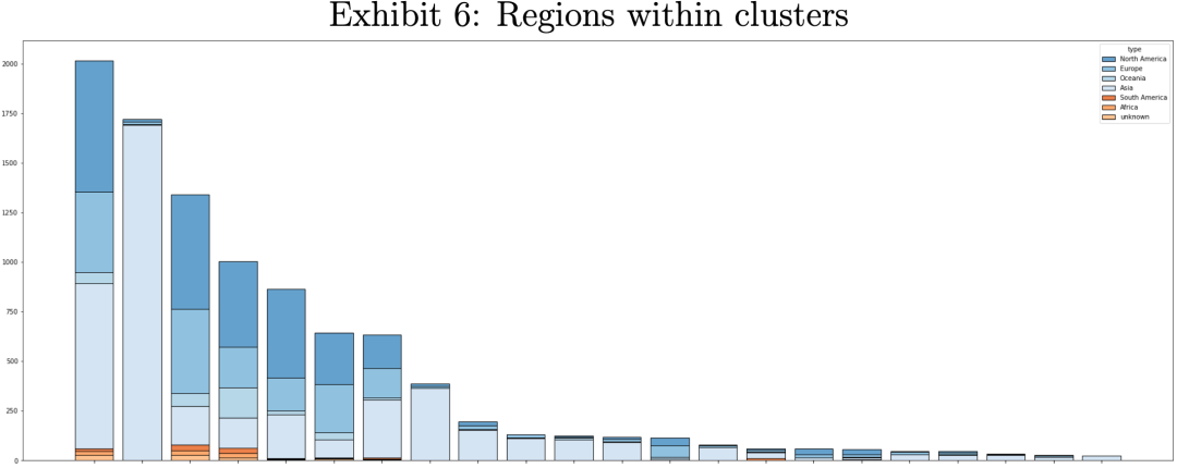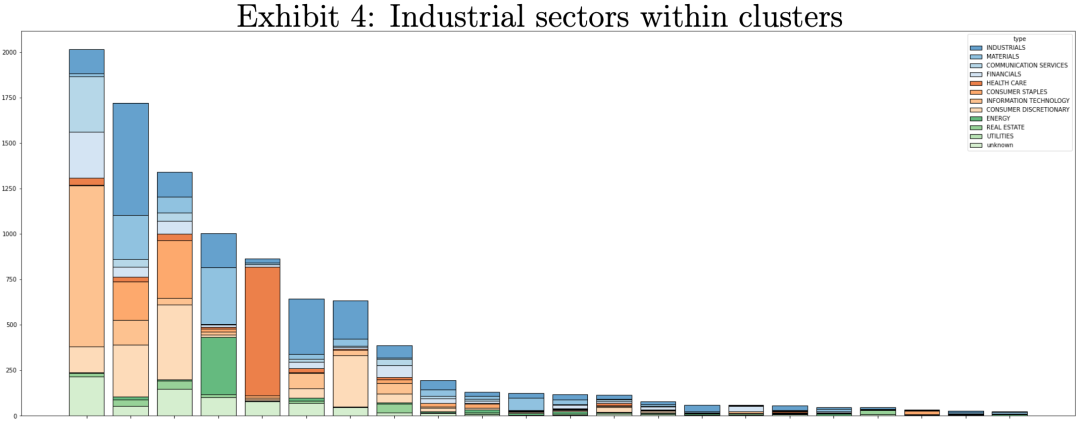 在分析大型、复杂的图和网络时,通常可以使用社区检测(community detection)算法那对图网络有一个直观的了解。社区检测是图分析中最具计算挑战性的问题之一,在相关文献中可以找到各种方法,从简单的层次聚类到最新的基于神经网络的方法。正如Fortunato(2010)中详细解释的那样,modularity optimization是使用最广泛的方法之一,因为它的性能、可解释性和简单性。本文所展示的所有聚类结果都是通过modularity optimization的方法得到的。这里需要说明一点:图有几个相互连接的部分(或称为组件),其中每个节点都在内部进行连接,而没有与外部组件的连接。通常所说的大组件是图中最大的连接组件,但还有许多其他的更小的、连接的和成对断开的小组件(连接的公司数量只有2到3个)。当应用聚类算法时,较小的连接组件将被算法识别为独立的集群。但在以下实际分析过程中,本文只基于在大组件中使用社区检测算法。对基本网络的进行聚类分析的主要结果如在下图3所示。它显示了大组件内的每个集群的规模(深蓝色条)和集群内上市公司的数量(浅蓝色条)。不难看出,规模最大、关联度最高的集群中,上市公司的比例都相当,不存在明显的集中效应。这一特点体现了供应链中上市公司和非上市公司之间的强大相互作用。这一事实证明了供应链数据在理解上市公司股票收益方面的附加价值:这类数据突出了单纯从市场数据无法明确识别的相互作用,因此人们可能希望通过供应链更好地理解资本市场。如前所述,集群内上市公司和非上市公司的划分是相当同质的。为了进一步评估这种聚类的有用性,自然要将其与板块分类、国家或区域等其他通常的分类进行比较。这些群体与集群的差异越大,重叠越少,就能从供应链数据中获得更多的新信息。在本节中,我们首先通过实证分析,然后通过使用自定义相似性度量的定量评估,分析这些群体和集群之间的重叠。我们GICS一级行业分类为基础,分析集群-板块的重叠。图4通过显示按大小排序的每个集群中的板块分布,可以看出集群和板块没有明显的重叠。但有一个明显的例外,“医疗保健”部门几乎占据了第五组。除此之外,本文还分析了集群中公司所在地区的分布,图6显示了在某些集群中亚洲公司的比例非常高,这一事实可能只是由于我们的数据集中亚洲公司的比例很大所致。相关性分析