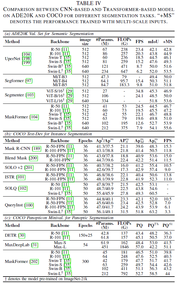 论文根据三个不同的任务总结了上述Transformer。表IV(a)侧重于ADE20K(170类)。可以表明,当在具有大量类的数据集上进行训练时,ViT的分割性能显著提高。表IV(b)侧重于实例分割的COCO测试数据集。显然,在分割和检测任务中,带有掩模嵌入的ViT超过了大多数主流模型。然而,APbox和APseg之间存在巨大的性能差距。通过级联框架,QueryInst[100]在各种Transformer模型中实现了SOTA。将ViT与混合任务级联结构相结合,值得进一步研究。表IV(c)侧重于全景分割。Max-DeepLab[31]通常通过掩码预测形式解决全景分割任务中的前景和背景问题,而Maskformer[104]成功地将这种格式用于语义分割,并将语义和实例分割任务统一为一个模型。基于它们在全景分割领域的表现,我们可以得出结论,ViT可以将多个分割任务统一到一个box-free框架中,并进行掩模预测。