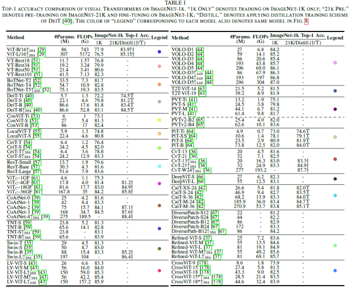 算法评估和比较分析:在论文的分类法中,所有现有的监督模型被分为六类。表一总结了这些现有ViT在ImageNet-1k基准上的性能。为了客观直观地评估它们,论文使用以下三张图来说明它们在不同配置下在ImageNet-1k上的性能。图8(a)总结了2242个输入大小下每个模型的精度。图8(b)以FLOP为水平轴,重点关注其在更高分辨率下的性能。图8(c)侧重于具有外部数据集的预训练模型。根据这些比较结果,论文简要总结了在效率和可伸缩性方面的几项性能改进,如下所示: