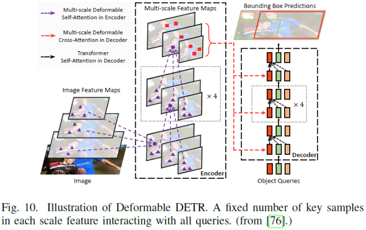 继[186]之后,Zhu等人开发了Deformable DETR,以通过多尺度deformable attention显著改善训练收敛性和检测性能[76]。与原始DETR相比,deformable attention模块仅对一小部分关键点进行采样,以进行全特征聚合。这种稀疏注意力可以很容易地扩展到多尺度特征融合,而无需FPN[187]的帮助,因此称为多尺度可定义注意力(MSDA),如图10所示。其他相关算法ACT[77]、PnP[78]、Sparse DETR[79]可以参考具体论文。