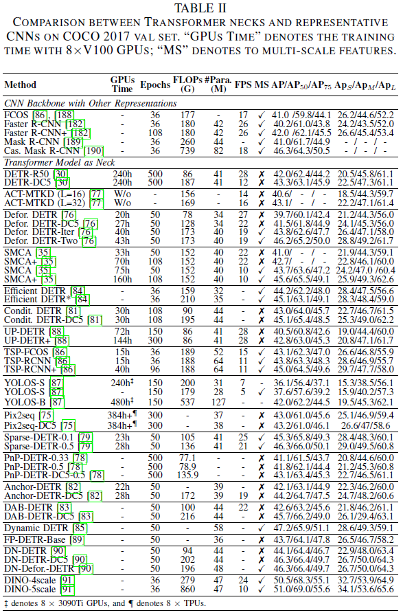 论文在表II中总结了Transformer neck检测器的五个部分,密集预测任务的Transformer backbone的更多细节参见表III。大多数neck提升集中在以下五个方面: