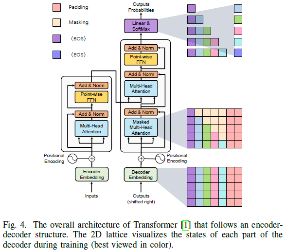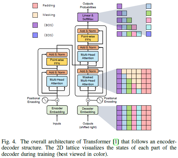 在自然语言回归模型中,Transformer源于机器翻译任务。给定一个单词序列,Transformer将输入序列矢量化为单词嵌入,添加位置编码,并将生成的向量序列输入编码器。在训练期间,如图4所示,Vaswani等人根据自回归任务的规则设计了masking操作,其中当前位置仅取决于先前位置的输出。基于这种masking,Transformer解码器能够并行处理输入标签的序列。在推理期间,通过相同的操作处理先前预测的单词序列以预测下一个单词。