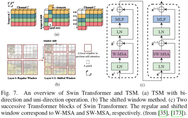 ViT[29]中的coarse patchify过程忽略了局部图像信息。除了卷积,研究人员提出了一种局部注意力机制,以动态关注相邻元素并增强局部提取能力。代表性方法之一是Swin Transformer[35]。类似于TSM[173](图7(a)),Swin利用沿空间维度的移位窗口来建模全局和边界特征。具体而言,两个连续的window-wise attention可以促进cross-window相互作用(图7(b)-(c)),类似于CNN中的感受野扩展。这种操作将计算量由降低至。其他相关算法TNT[59]、Twins[60]、ViL[61]、VOLO[44]可以参考具体论文。