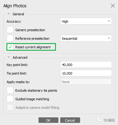 选择工作流>对齐照片命令。在“对齐照片”对话框窗口中,指定首选参数。可以使用基本参数,就像在常规图像对齐的情况下一样,主要区别在于启用重置当前对齐选项很重要: