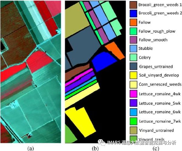 Salinas 是由 AVIRIS 传感器拍摄,拍摄地点是加州 Salinas Valley。这个数据的空间分辨率是3.7米,大小是512*217。原始数据是224个波段,去除水汽吸收严重的波段后,还剩下204个波段。这个数据包含了16个农作物类别。