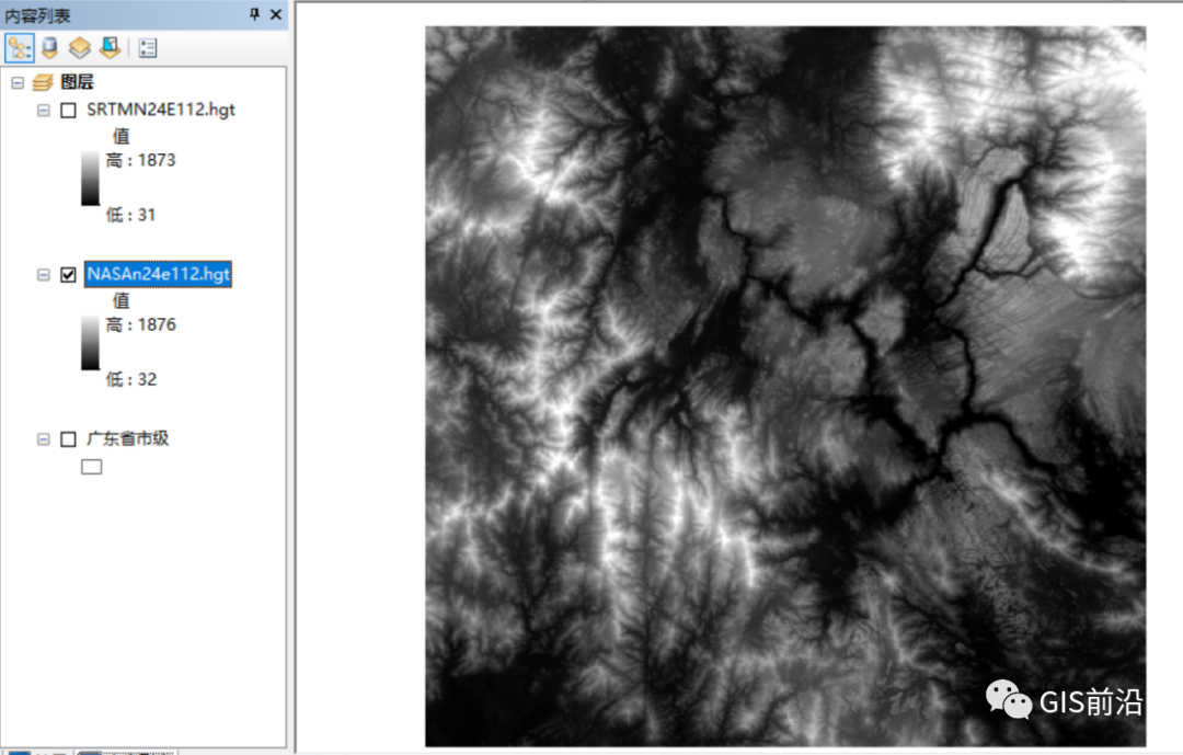 这样看到底有何区别?当然看不出来,但是首先在最低点和最高点上,想必大家一经发现,NASADEM与SRTM略有不同,那么在细微处,其实也有不同,仍然是先看SRTM,再看NASADEM。