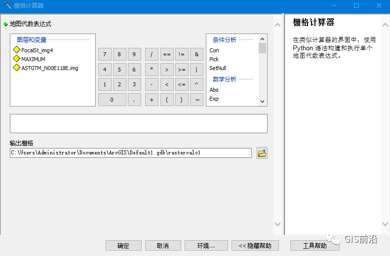 输出栅格依旧为默认数据库,名称改为qfd,栅格计算时用于计算的栅格数据像元大小必须一致,否则会导致计算失败。