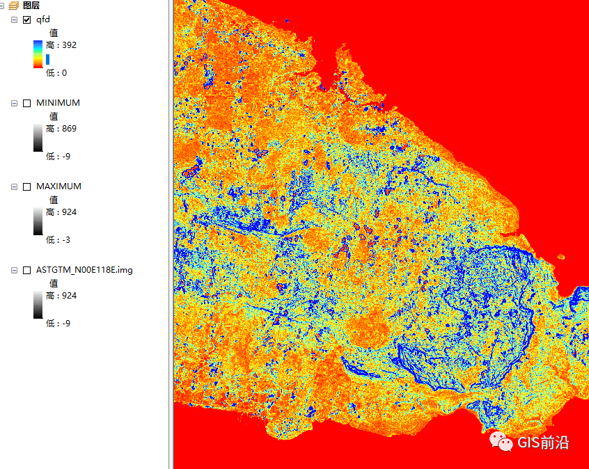 点击红色区域发现值为0,即平地地区
