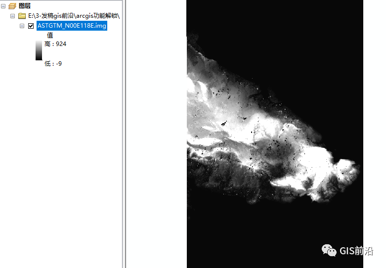 1、 打开ArcMap将DEM文件ASTGTM_N00E118E.img添加到数据框。
