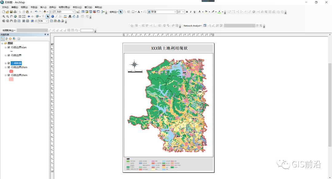 首先我们打开ArcGIS加载进来三调数据,这是镇的数据,现在我们需要村的行政边界。首先打开属性表添加一个新的字段命名“行政代码”字段属性为文本,文本长度保持默认。在行政代码列打开字段计算器输入Left(ZLDWDM,12) 这个命令可以提取ZLDWDM的从左数前12位数字,也就是村的行政代码。地理处理工具调出融合命令,融合字段选择ZLDWDM和ZLDWMC,点击确定后生成新的shp文件,右击打开属性表后看到字段只剩下村名以及村的行政代码。双击图层调出属性面板,点击符号-编辑符号-掩膜-晕圈,为字体添加白色描边。点击图层右键找到标注要素,勾选上,然后将图层填充和描边改为无,则标注完成。如出现标注名称重复,则放置属性改为每个要素放置一个标注。我们继续对三调数据融合,融合字段选择无,生成新的面要素,填充改为无,描边选择粉红色,然后复制粘贴一个,同样填充为无,描边为颜色稍深的粉红色,则生成一个渐变的晕圈。下一步我们对三调进行符号化,双击调出属性面板,类别-与形式中符号匹配,选择三调符号库进行匹配,点击匹配样式完成符号化,如下图所示。之后我们切换到布局视图,点击插入图例,右键转换为图形并取消组,进行排版。我们插入图例时可以选择图例的列数,然后选择是否有外轮廓的填充背景以及填充图框点击插入,内图框线,填充浅灰色后作为图框。点击插入标题以及指北针、比例尺等元素,完成出图。总结:三调数据融合形成下一级别行政边界,同时融合形成晕线。对三调进行标注并符号化,插入图例以及图名比例尺及其他要素。- END -