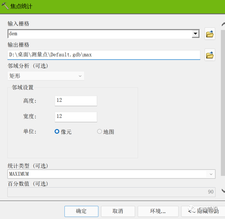 设置统计类型为最大值(MAXIMUM),邻域的类型为矩形(也可以为圆),邻域的大小为12×12(这个值也可以根据自己的需要进行改变),则可得到一个邻域为12×12的矩形的最大值数据层,记为max;
