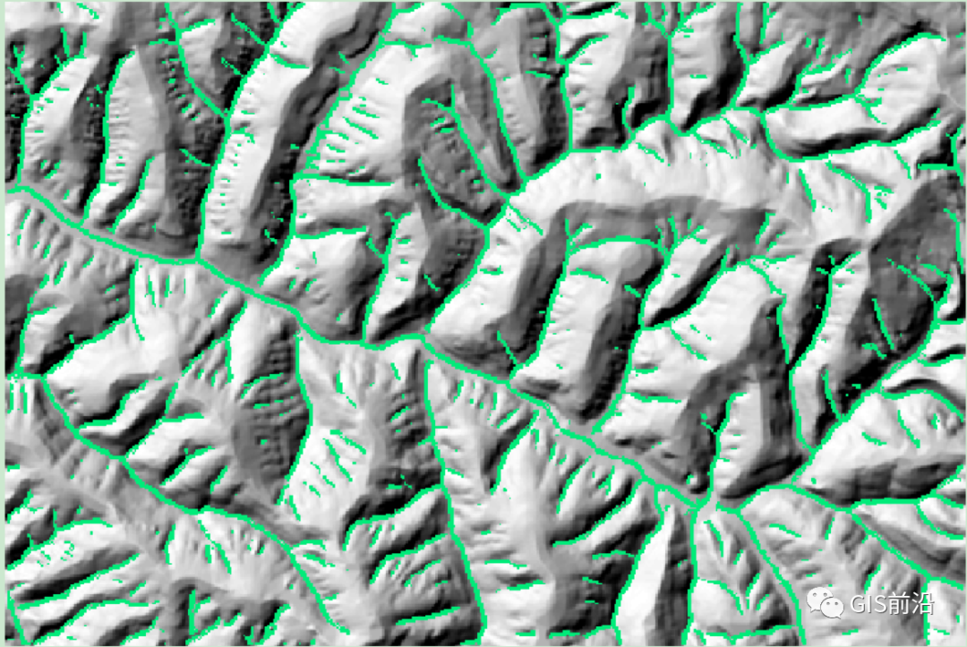 绿色部分是符合条件的栅格像元,值为1,其余黑色的都不符合要求,所以值都为0,这样看起来感觉不出山脊线,为此我们进行重分类,将值为0的栅格像元设置为NoData,得到结果后叠加到山体阴影上面,山体阴影设置和最终展示结果如下图所示: