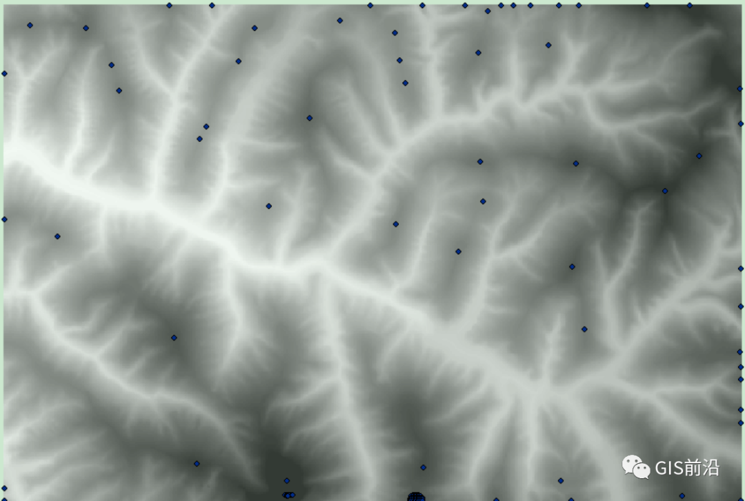 由于受到邻域分析中分析窗口大小的影响,窗口越大提取的点越少,但是窗口过大的话,将会漏掉一些重要的山顶点,为此需要设置合适的窗口大小,对提取的结果,可人工判断删除一些不符合条件的山顶点,最后进行符号化,结果如图所示:
