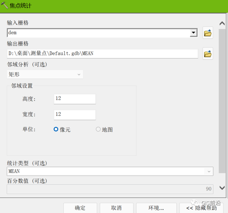 (2) 点击初始DEM数据,使用【Spatial Analysis工具】【邻域分析】【焦点统计】工具;设置统计类型为平均值(MEAN),邻域的类型为矩形(也可以为圆),邻域的大小为12×12(这个值也可以根据自己的需要进行改变),则可得到一个邻域为12×12的矩形的平均值数据层,记为MEAN;