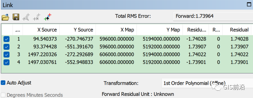 这时候我们点击地理配准工具条上面的按钮,查看并导出RMS误差表: