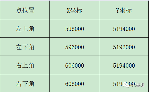 我们点击按钮,放大数据到左上角网格交叉点处右键选择“输入X、Y坐标”:(596000,5194000),一般这种我们至少要4个点才能保证这个配准结果的准确性,所以我们分别给左下角、右上角、右下角输入X、Y坐标,前面给了提示方里格网间隔是2000米,小编做了一个表格(虽然有点麻烦但是不容易出错哦):