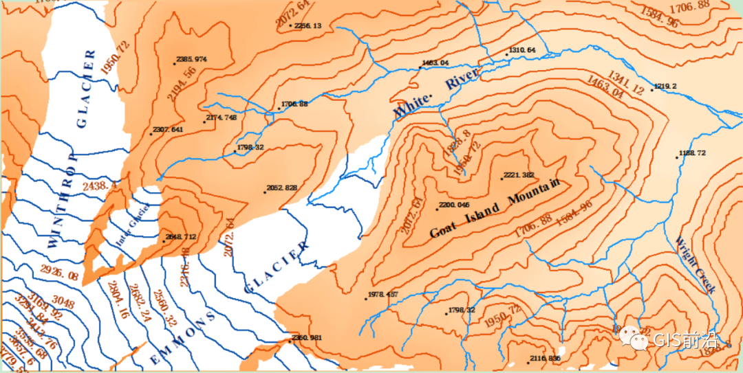 我们要将图层按照点线面叠加起来,这样后面的图层才会最大限度地减少被遮挡要素,从下往上:高程栅格—冰川—等高线—冰川上面的等高线—河流—高程点