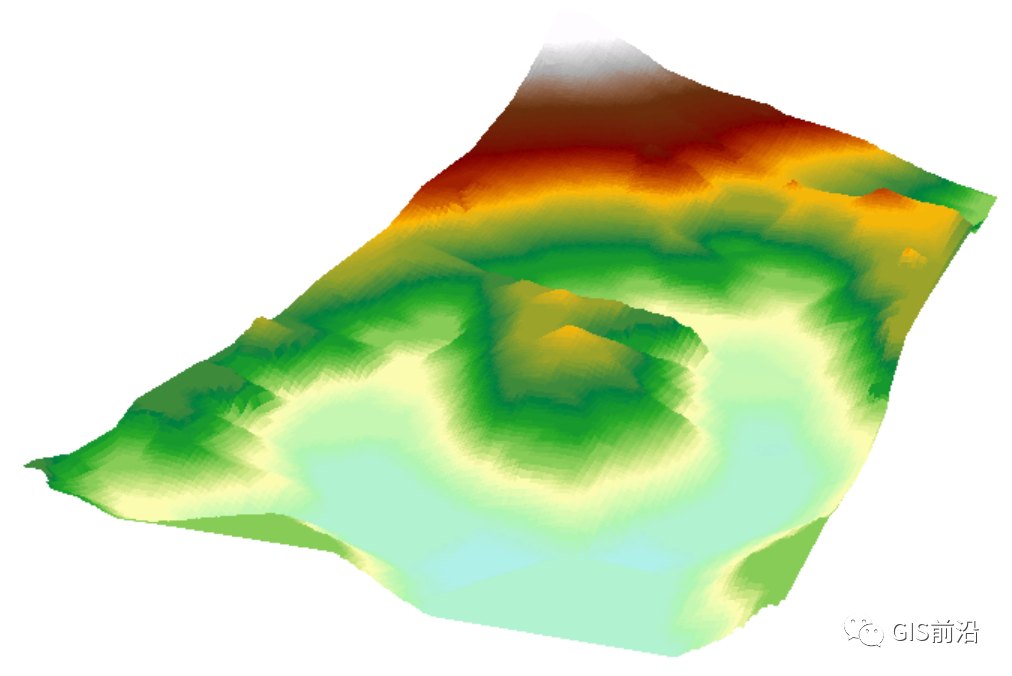 我们打开ArcScene,将之前【TIN转栅格】的输出数据加载进来,我们右键属性,选择【基本高度】,勾选【浮动在自定义表面】后点击确定即可,这时候图层已经根据高程被拉伸了三维模型的顶算是做好了,但是还要一个底来加持。