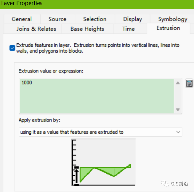 右键刚才输出的栅格范围线数据,在拉伸选项卡中勾选“拉伸图层要素”,“拉伸值”:1000,“拉伸方式”选择:将其用作要素的拉伸数值,整个意思就是将所有线要素拉长到海拔1000米的水平面,最后点击确定。