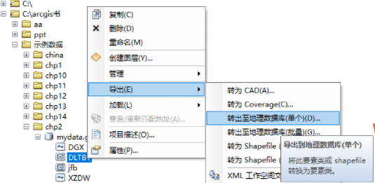 2.右击DLTB1,导出→转出至地理数据库(单个),如图2-47所示。