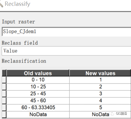 记得在进行分析之前确保坐标系是正确的并且地图显示单位为米,对距离栅格进行【空间分析】|【重分类】|【重分类】分析,相关参数设置如下图所示:
