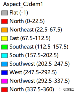 接下来使用工具【空间分析】|【表面分析】|【坡度】和【坡向】对裁剪出来的数据分别进行坡度和坡向分析,完事之后打开【空间分析】|【重分类】|【重分类】工具,根据题目要求要划分为5种情况,但是查看坡向图例可以发现有9种划分,分别是正北(337.5-360、0-22.5)、东北(22.5-67.5)、正东(67.5-112.5)、东南(112.5-157.5)、正南(157.5-202.5)、西南(202.5-247.5)、正西(247.5-292.5)、西北(292.5-337.5)和平地(-1)。