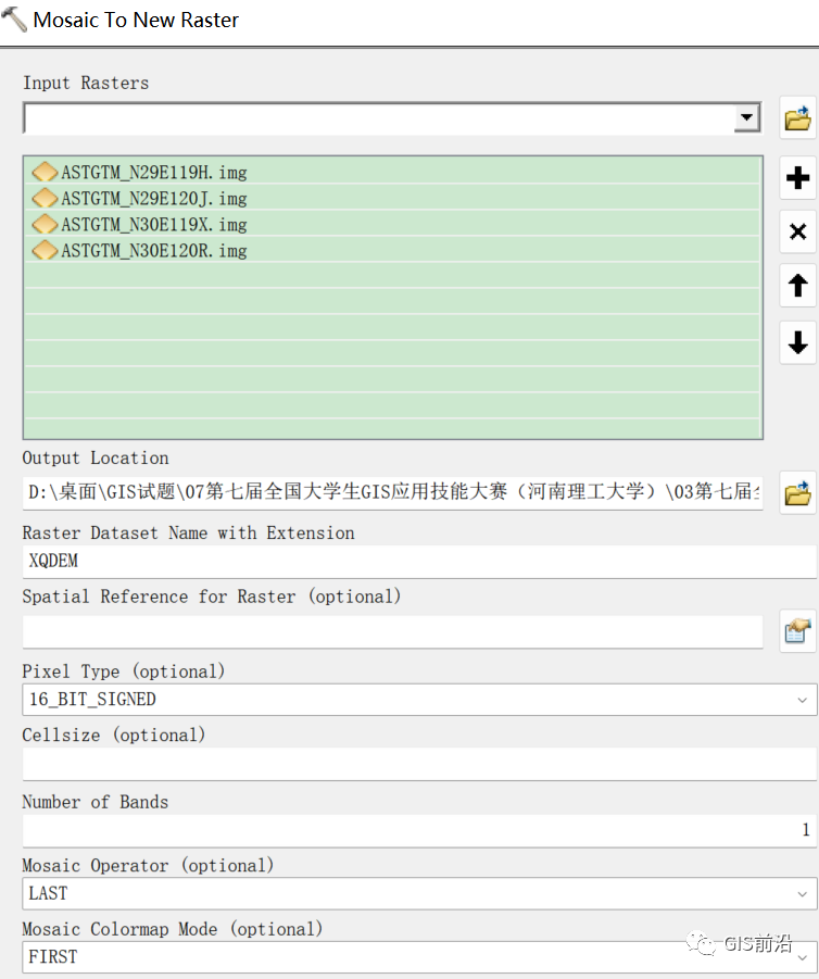打开【数据管理工具】|【栅格数据集】|【镶嵌至新栅格】工具,将4景数据加载进,相关系数设置如下:
