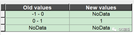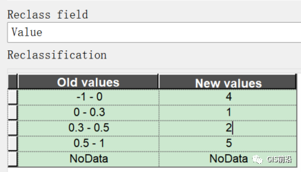 在输出的结果图层中值域范围还是-1~1,我们使用提取大于0的区域作为水域,我们再次使用【空间分析】|【重分类】|【重分类】工具,将0-1以外的部分划分为NoData值,如下图所示: