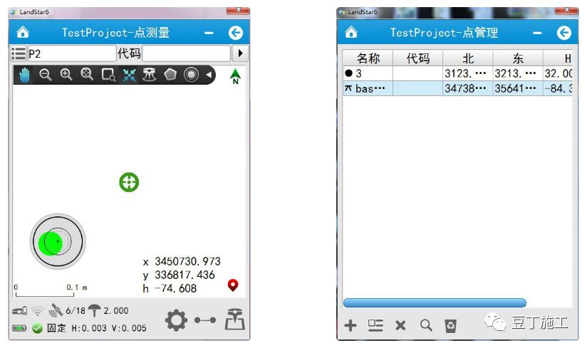视图区域:显示当前点到放样线最近点的方向线,有了具体放样目标后, 会实时显示当前点到放样线上目标点的偏移量,距离,方位角等。