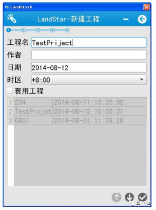 点击主菜单【工程】→【工程管理】→【新建+】进入创建工程向导, 如图所示,弹出新建对话框,在“工程名”中输入工程名称;“作者”中输 入操作员的姓名;“日期”默认是当地时间;“时区”是指当地时间和 GPS 时间 相差的时区,可以在下拉列表中选择-12 时区到+12 时区。