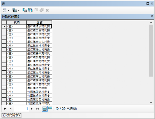 2.在ArcMap下打开“行政代码表.xls”中的“行政代码表$`”属性表,打开后的显示界面如图11-19所示。