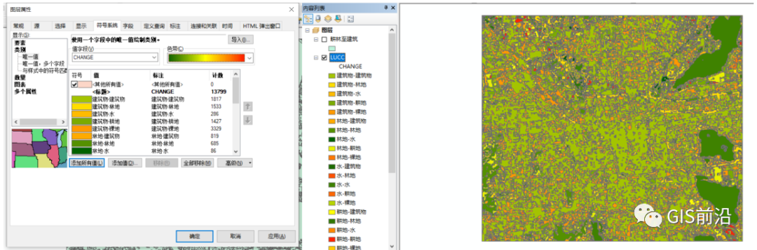 接着我们就来到了土地利用转移矩阵的制作了,因为当土地利用转移矩阵制作完成,我们自然可以快速地提取出2010年是林地/耕地,并且2015年变为建筑用地的区域了: