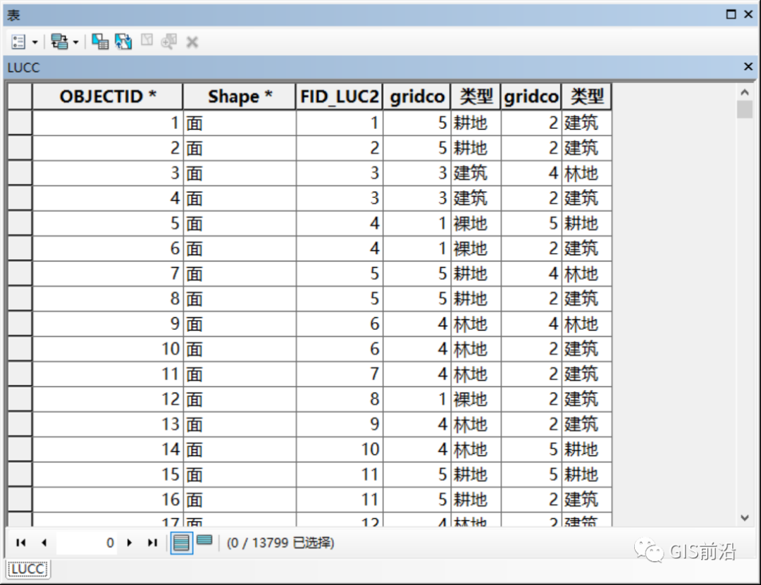 最终我们得到名为LUCC的土地利用转移矩阵矢量图层,我们打开属性表观察,位于前面的类型是2010类型,位于后面的类型是2015类型: