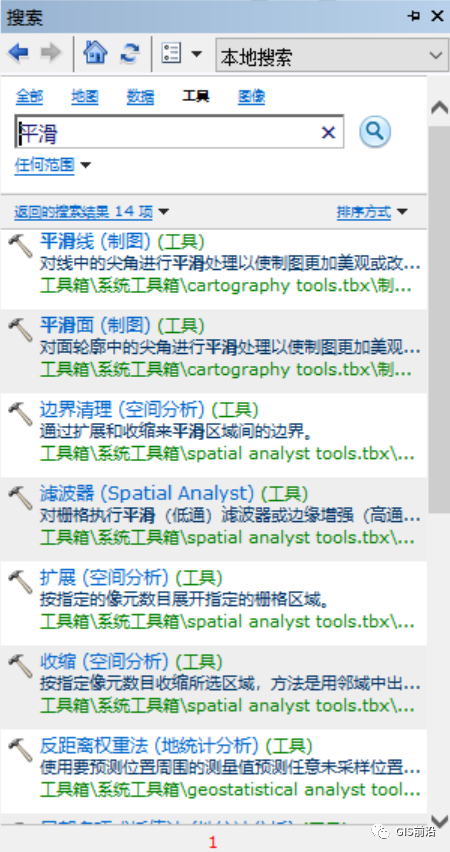 这里就需要告诉观众老爷们,请善用ArcGIS中的搜索工具哦~有时候即使说你不知道要用哪个工具,但比如第三步中的平滑,虽然我不知道要用到边界清理工具,但是我只要搜索“平滑”二字,它同样会跳出来具有此功能的工具,然后我们只需要一个个查看就可以了,别看出来的工具多,有的是针对矢量的,有的是针对栅格的,然后有的针对线,有的针对面,其实最后往往只剩下1个或者2个工具,而那个工具也往往就是你的真命工具~~~~~~