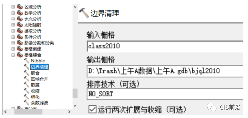 我们得到class2010之后,也可以将其的图例颜色选择和class2015相同,方便我们观察变化的区域,下一步我们需要对分类后的结果的边界进行一定的平滑处理,这里我们使用到的是栅格综合的边界清理工具: