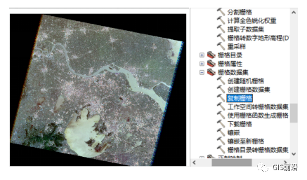合成之后我们需要去除黑边,左下图是未去除黑边的影像图,ArcGIS中去除黑边有太多种方法了,观众老爷们可以自行百度~这里我们采取一种比较简便的——复制栅格: