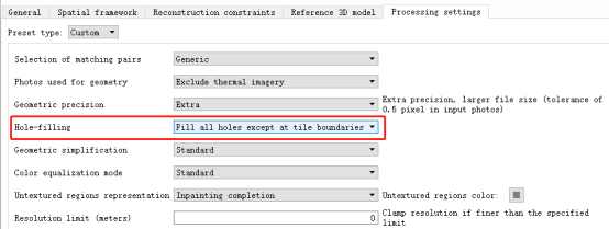 此方法对第2类墙面破洞和第4类女儿墙破洞有一定效果。在Processing setting--Hole filling中选择Fill all holes except at tile boundaries(填充除块边界外的所有孔洞),但填充完整的墙面也可能出现凹陷的情况。