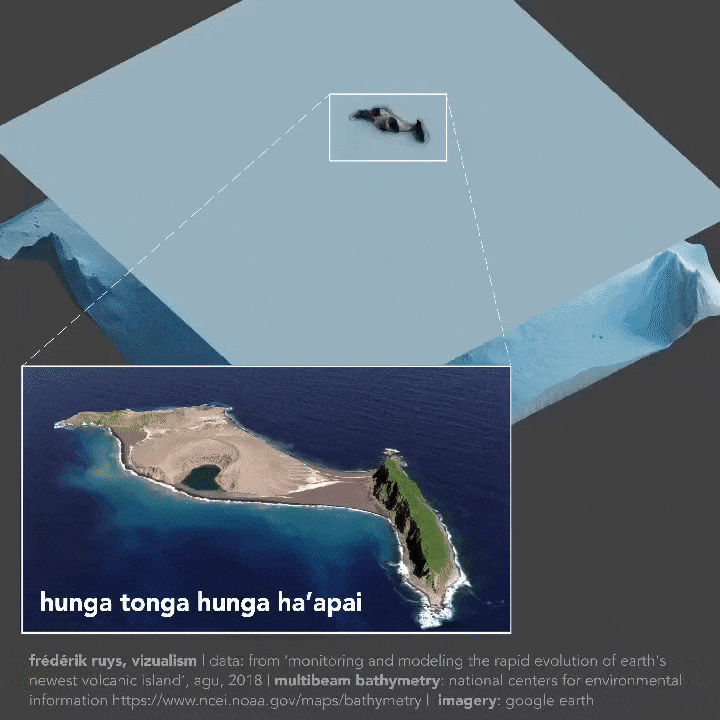 荷兰数据可视化分析师frédérik ruys根据美国地球物理学会和美国海洋大气管理局的勘测数据绘制了汤加海底火山的3D模型 | google earth