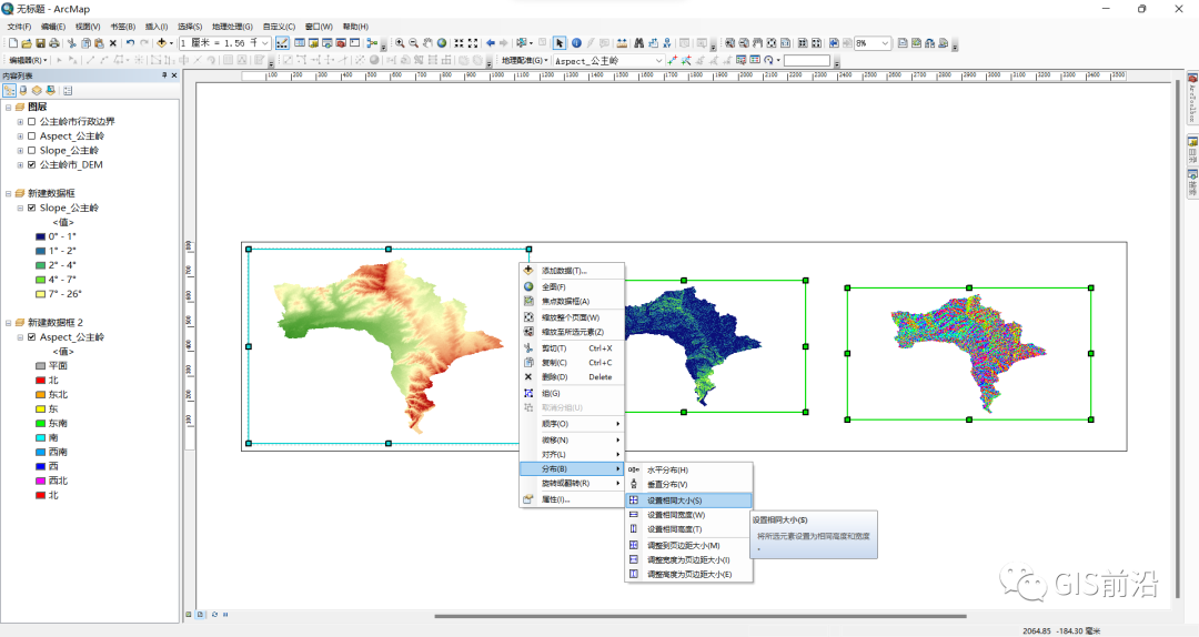 三个数据框全部选中,右键选择分布 -> 设置相同大小,调整位置再次选择水平分布。