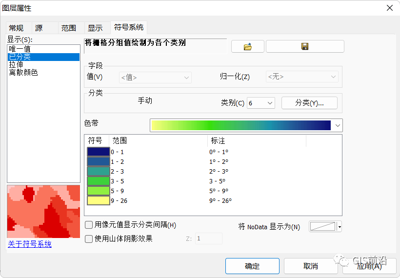 右键坡度图层,选择属性 -> 符号系统 -> 已分类,选择一个合适颜色或者使用默认颜色,类别可以根据需要进行调整,点击分类,可设置中断值为整数,在标注栏里编入坡度级。