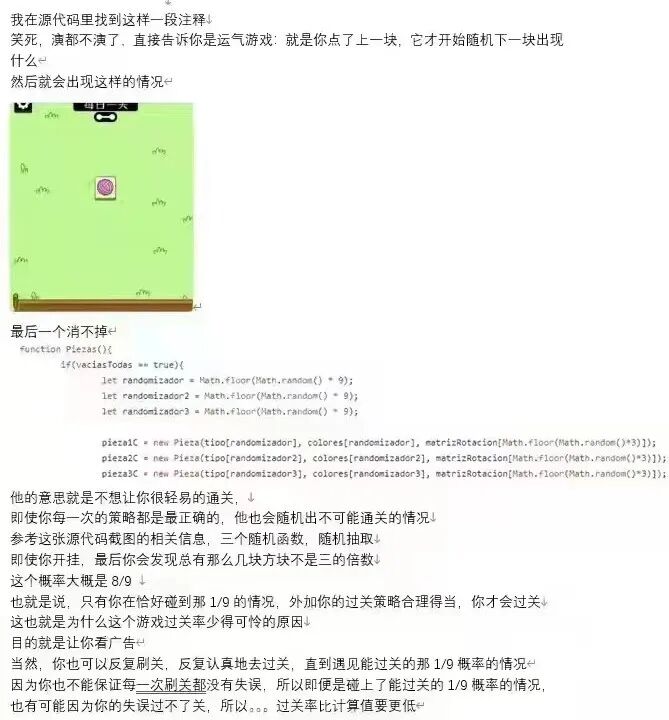 在此之前,还没有休闲小游戏敢于如此为难玩家。作为一种大众娱乐产品,游戏应该是以讨好玩家,给玩家提供舒适的游戏体验为目标。但《羊了个羊》的大胆之处就在于,它给了玩家一个可以通关的幻觉,并且用唾手可得的胜利去诱惑玩家。最后,在胜利前夜,会给玩家一次迎头痛击,让玩家与胜利失之交臂。这种“从简单到打脸”的强烈反差,以及号称的“只有0.01%”的通关率,再加上进入游戏的时候会按照玩家所在地区进行排位,只有顺利完成第二关的玩家才能给家乡争光——种种设计,都在激发玩家的好胜心。而分享链接即可获得道具,又加速了这款游戏的病毒式传播。所以,回到本文一开始的问题:第二关到底有没有办法突破呢?我们再来仔细看一下消除盘,游戏的消除盘分为两个区域,一个是可以看到消除要素的明牌区域,一个则是背对玩家的暗牌区域。同时,在明牌区域还有一些堆叠起来的卡牌,除非你移开上一层,你是没办法看到下一层还有什么牌。玩家在一开始的信息能从游戏盘中获得的信息,就是不完全的,所谓一层层地消除,其实就是一层层掀开棋盘的底牌,让玩家获得100%信息的过程。一般来说,消除游戏的关卡都是由关卡设计师手动调整,保证玩家的体验相对流畅。但如果《羊什么羊》并没有这么做,而是胡乱抓了一堆随机数,让玩家去瞎蒙,蒙对了就算过,蒙不对,那就蒙不对咯。而所谓的道具,也只是延长玩家在单个关卡内的消耗时间,对通关没有真正的帮助。这也就能解释,为什么99%的玩家都没法通过了。因为一开始就没有正确答案。打个比方的话,《羊了个羊》可以看作一个刮彩票的游戏。90%刮的人都是刮到“谢谢惠顾”,8%的人刮到安慰奖,2%的人刮到“恭喜你,你就是本局的天选之羊”。![]()