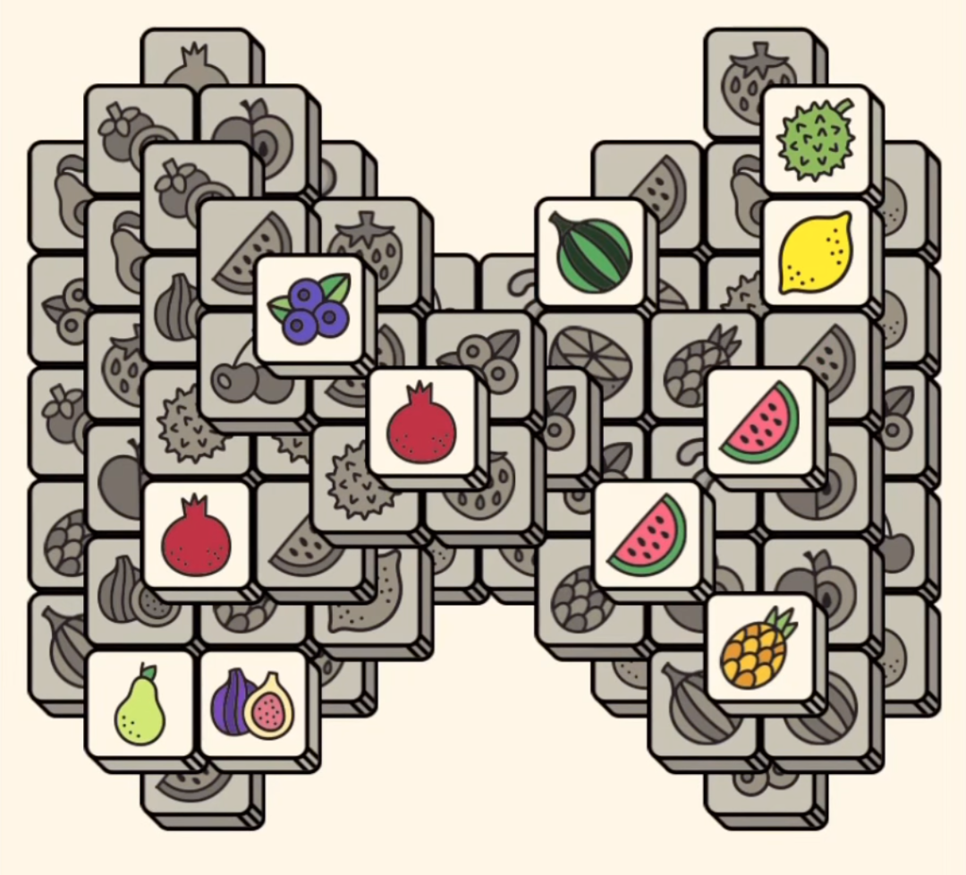 玩法乍看很简单。上面是一排排堆叠的方块(游戏介绍称之为“麻将”),下面是一个空槽,正好可以容纳7个方块。把上面三个相同的方块移到下面的空槽里,就可以把它们消掉(胡牌)。