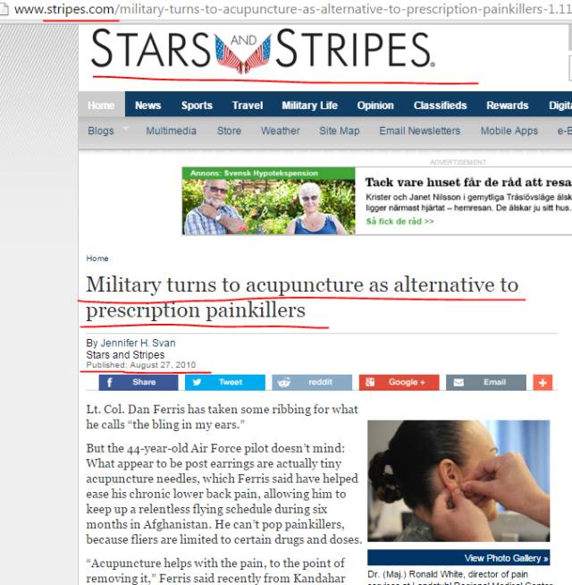 2010年8月的美国的星条旗报官网:美军转向针灸来替代止痛药!