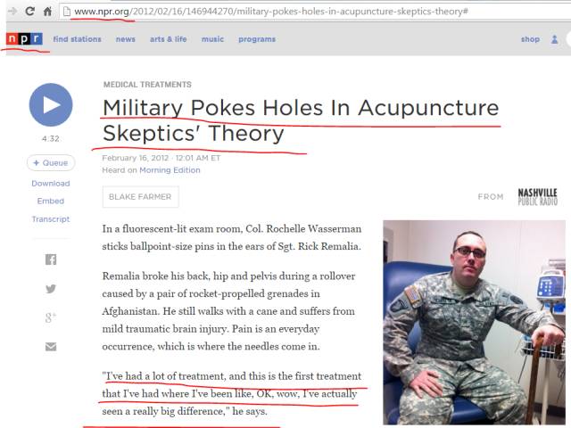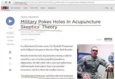 2012年2月世界著名的NPR(美国公共广播电台)的报道:美军戳穿了对针灸质疑的言论。上文划红线的文字意为:我已经接受过很多疼痛治疗,而本次针灸治疗是我经历的所有治疗中最喜欢的一个,因为我已经真正感受到了巨大的不同。