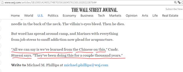 美国《华尔街日报》采访美军战地医生Stuessi时,Stuess说:我们能说的是:“我们已经从中国人那里学到了针灸治疗痛症,他们已经使用针灸几千年。”