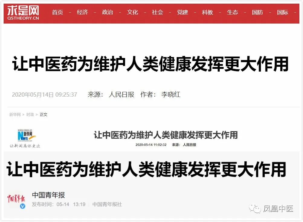 凤凰中医讯:近日,《人民日报》(2020年05月14日09版)上再次刊登力挺中医和支持中医发展的两篇长文。其中题为《让中医药为维护人类健康发挥更大作用》的文章中写道:习近平总书记指出:“中医药是中华民族的瑰宝,一定要保护好、发掘好、发展好、传承好。”在这次抗击新冠肺炎疫情斗争中,我们坚持科学防控,在药物研发和疾病救治上坚持中西医结合、中西药并用,充分发挥中医药的独特作用和价值,取得了显著成效。中医药抗击疫情的疗效备受国际关注,完全能够为维护人类健康发挥更大作用。![]()